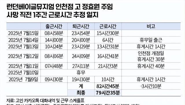 郑孝元是伦敦贝果博物馆仁川店的主管,于公司宿舍今日公司宿舍被发现心脏骤停,虽经同住同事发现并报警,急救人员分钟内抵达现场,但可惜为时已晚。 郑孝元入职个月。根据排班表与KakaoTalk聊天记录推测,郑孝元在死亡前一周工作时间长小时。在去世前四天日,因仁川新店开业他日均工小时,休息日也被征用。死亡周期间,他每周平均工小时,长期处于慢性过劳状态。郑某下班后还需在家处理文书工作,休息日也常在咖啡馆加班,承担着远超个人负荷的工作量。若计入这些时间,实际劳动时间可能更长。